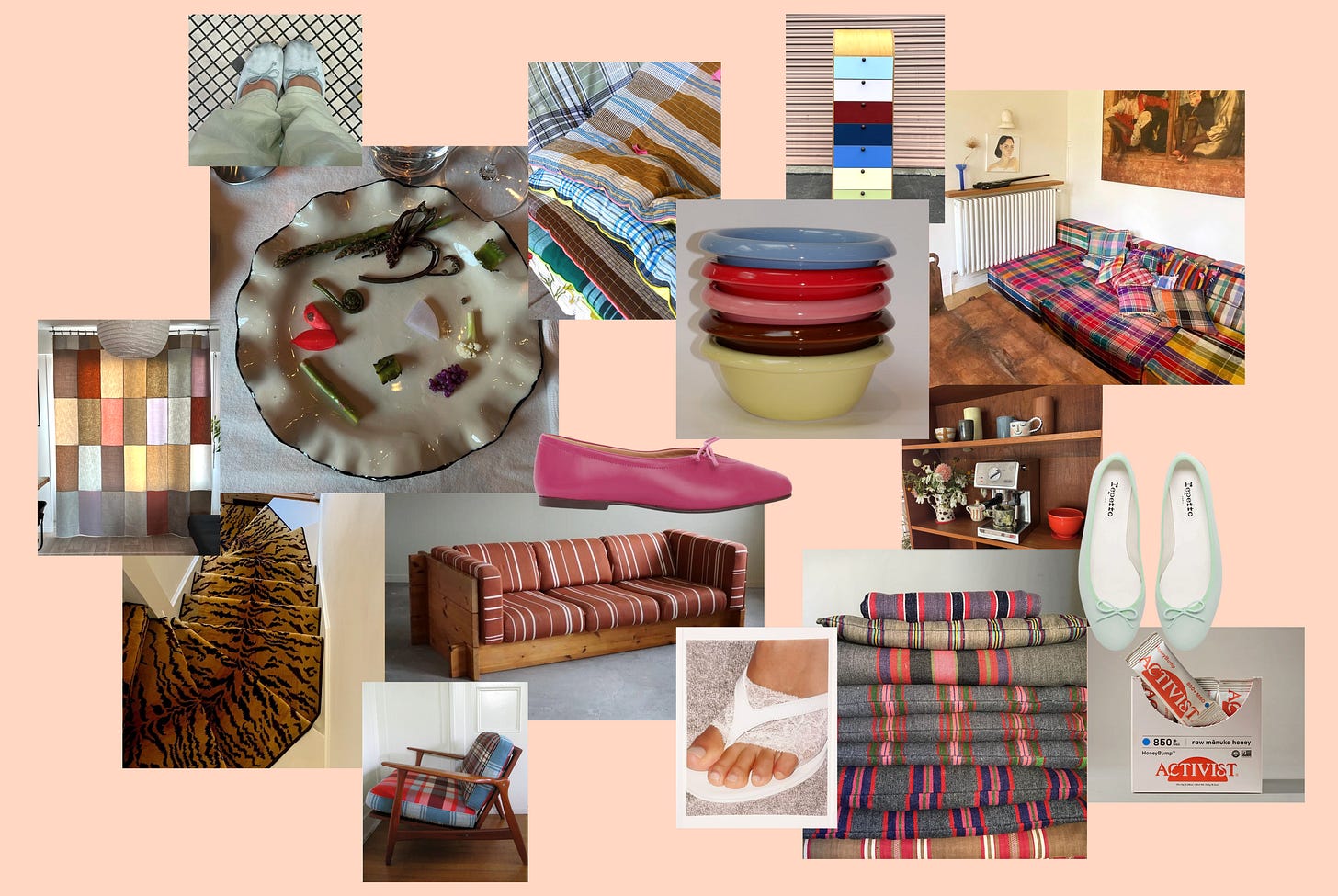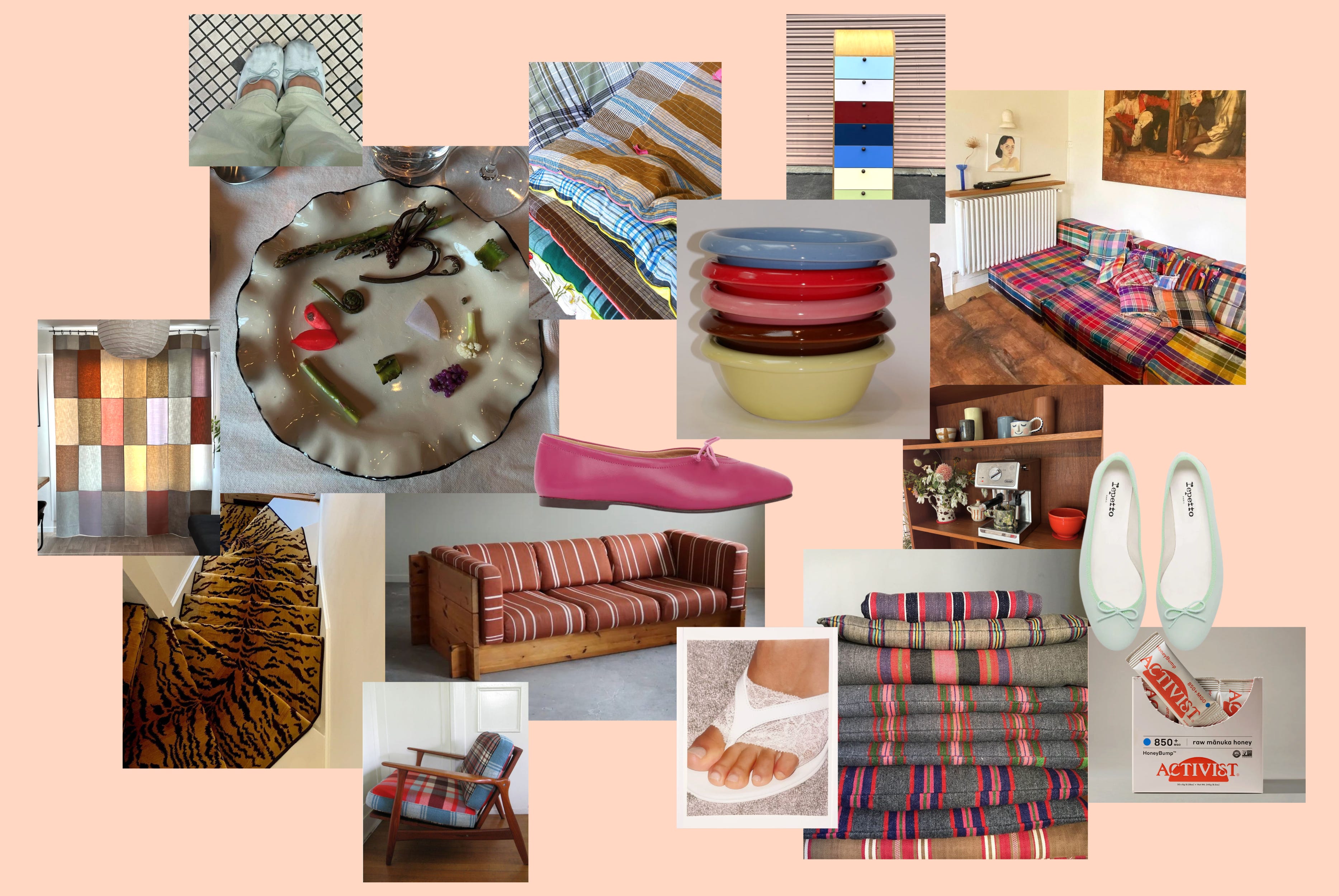 @ home: this algae oil is my new go-to for higher temp roasting, and these immunity-supporting manuka honey sticks are needed for my travel-heavy spring and summer. perfect for mainlining, adding to hot water and lemon, or sweetening matchas on the go. i am pro-animal print in the home, this zebra-adjacent jute runner is on the shortlist for my guest room. i’m using these mismatched colourful bowls to death, and my cute vintage diner-inspired mugs. my living room has a bizarre configuration and while i hunt for a *very specific* vintage love seat, i’m considering ordering a colourful linen couch cover to liven up the space. maybe baby pink? despite my early-season tan line, it’s still barely spring, which is to say that soup continues to be on the menu regularly. i became very fond of making a norwegian-inspired smoked salmon soup spiked with lots of fresh dill, lemon, fennel, and slow cooked leeks. the ever-classic pastina with chicken bone broth, lots of garlic and toasted black pepper is my go-to when i’m feeling rundown. i spike the italian penicillin with carrot, celery, shallot, and turmeric. i’m still dreaming about caldos de gallina luis even after a month of being home from cdmx. something about the creamy chickpeas and silky broth - i would douse mine in lime and chiles, HEAVEN. the ruffled nathalee paolinelli plates are on my mind, and will be on my birthday wishlist. i had a day bed made and i’m in the fabric hunting phase. i’m feverishly pulling inspo from vintage patterned furniture, think mismatched stripes, gingham and complementary solid hues.